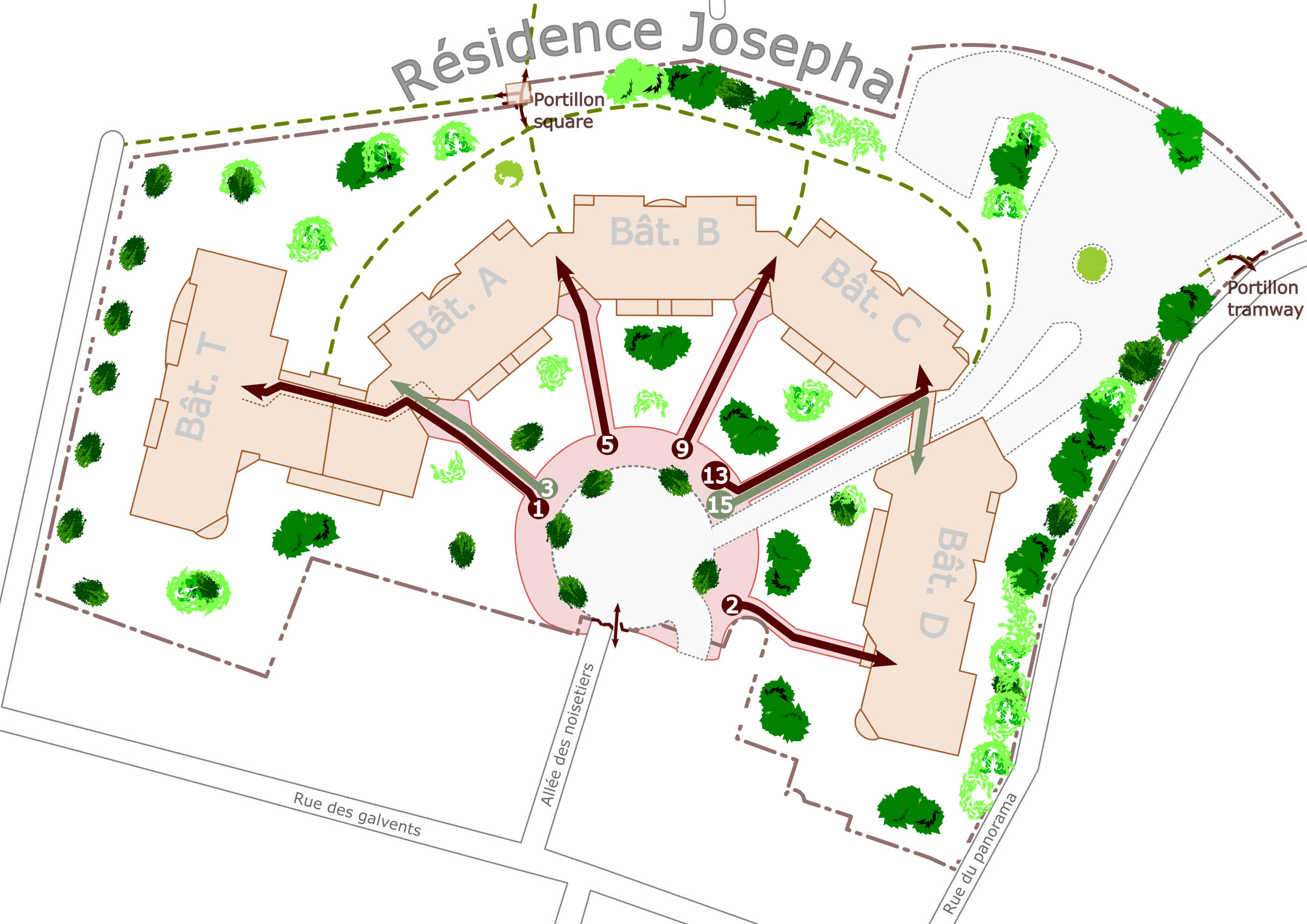 - Plan de la résidence avec les entrées et leur numéro postal ainsi que les portails piétons